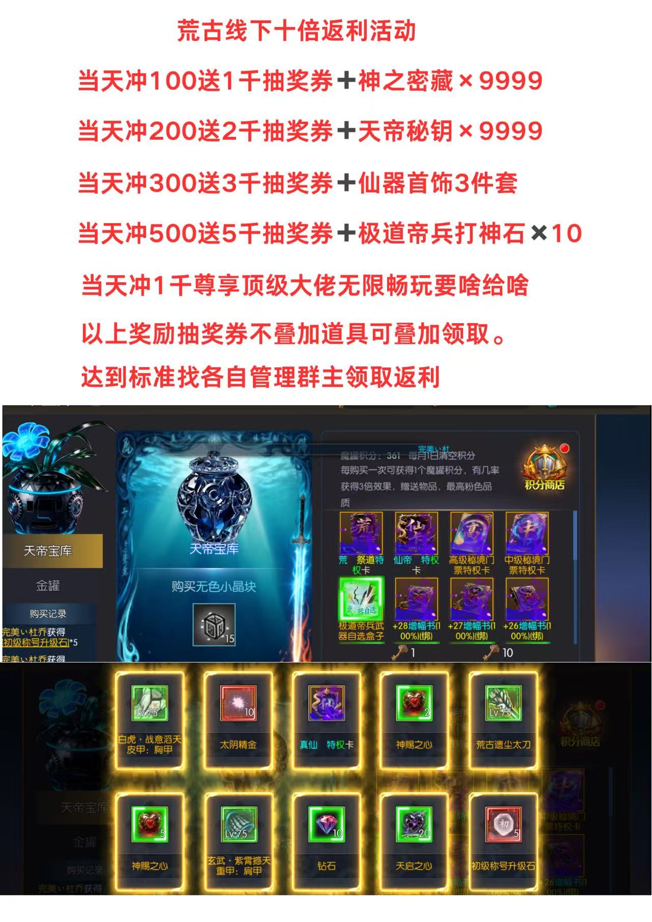 当天充值1千后。无限畅玩。只限当天。后续更新100装备新称号新光环新皮肤都是免费送。早冲早享受